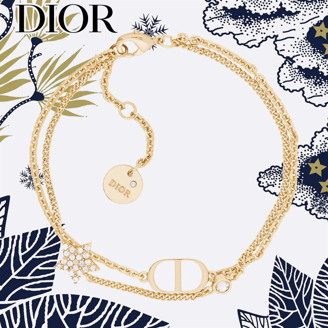 2本のゴールドトーンメタルのチェーンの一方にCDシグネチャーをあしらった、「Petit CD (プチ CD)」ブレスレット。もう一方のチェーンには、ホワイト クリスタルをパヴェ セッティングした、ムッシュ ディオールが愛したスターのシンボルと、控えめなホワイトのクリスタルを1つずつ飾りました。デイリーにお使いいただける、タイムレスでエレガントなブレスレットです。