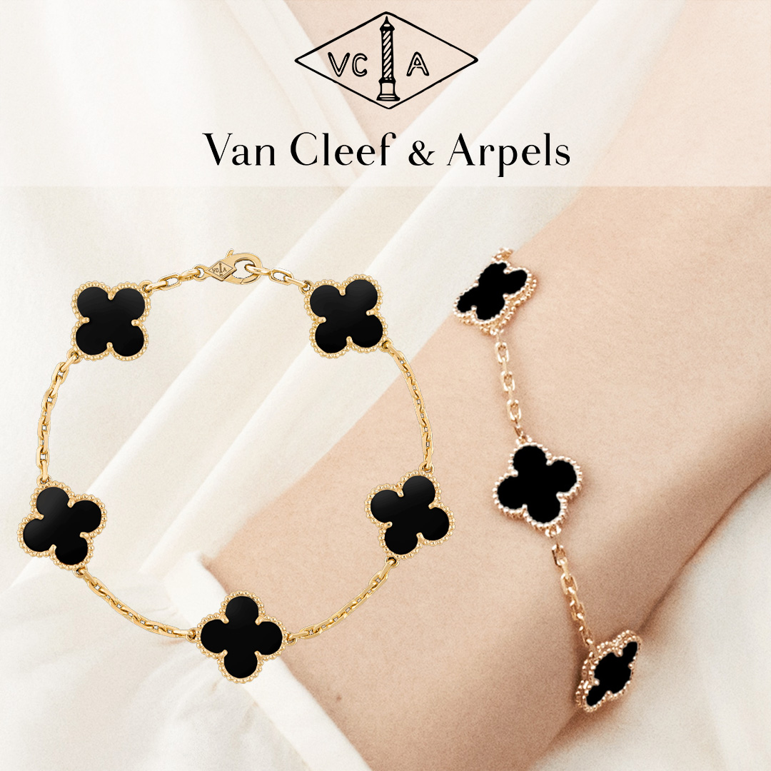 Vintage Alhambra手链,5图案 黄K金 缟玛瑙:  5颗 Front Jewelry BraceletVintage Alhambra手链,5图案 黄K金 缟玛瑙:  5颗 Worn Alternative Jewelry Bracelet